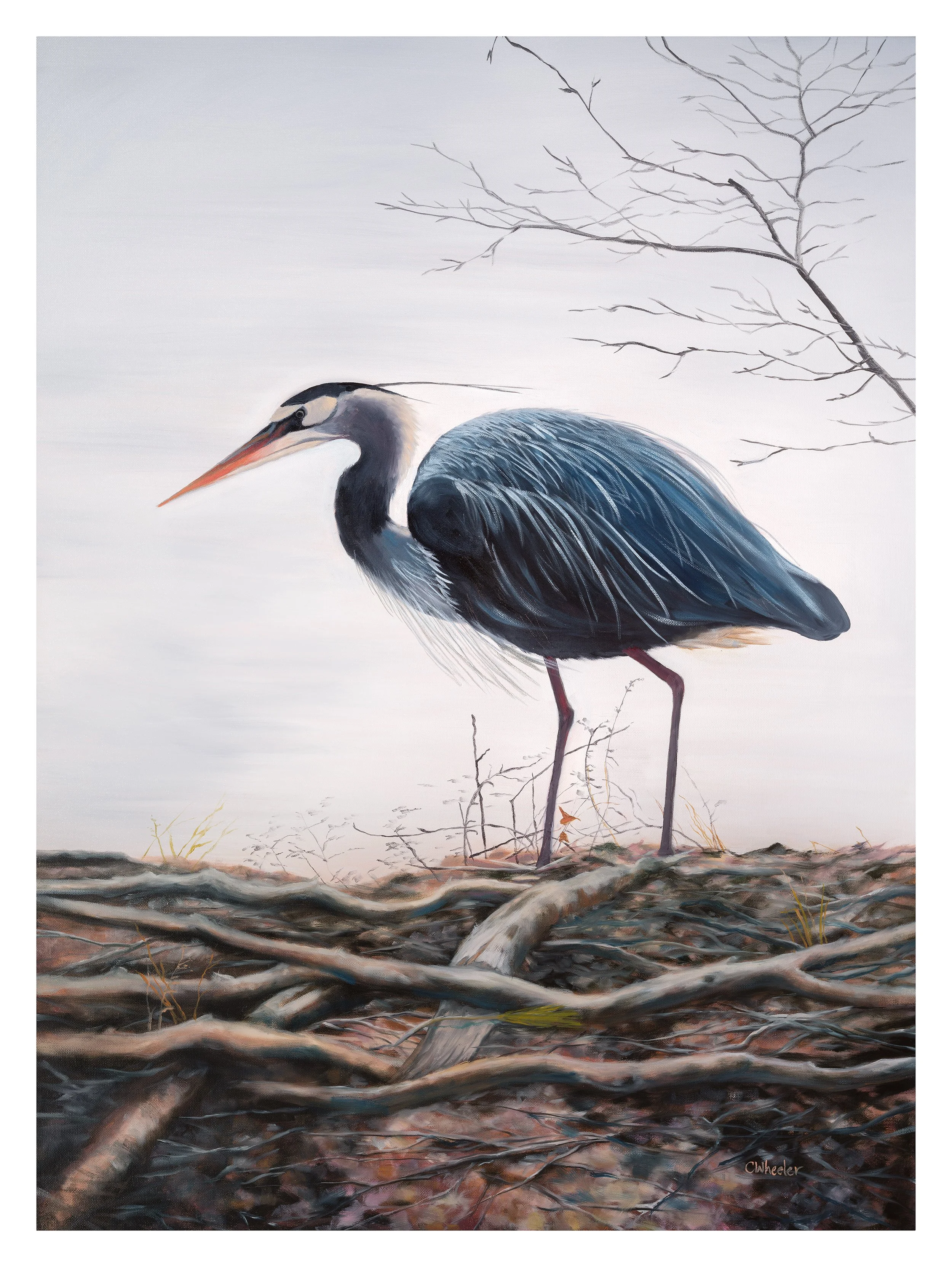 LAKE SHORE HERON IN AUTUMN ~ 24 x 18”, Oil on Gallery Wrapped Canvas, $1200